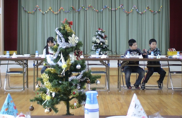 児童会活動の一つ「クリスマス会」を本日行いました。全校参加のお楽しみ会です。まずはクリスマス会食の準備です。christmas treeを囲んで机を配置。そこに特別給食を・・・。