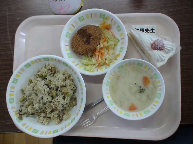 特別給食の献立は写真のとおり。子どもたちお待ちかねのshortcakeつきです。おいしくて,お腹いっぱいになりました。会食が終わったらすぐ片付けと次の準備です。