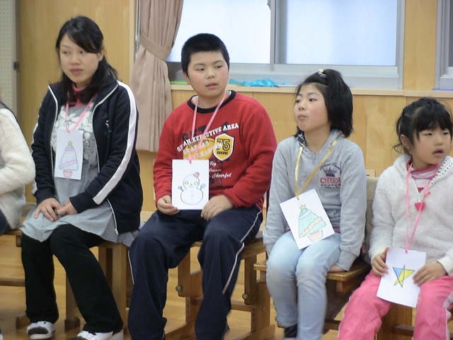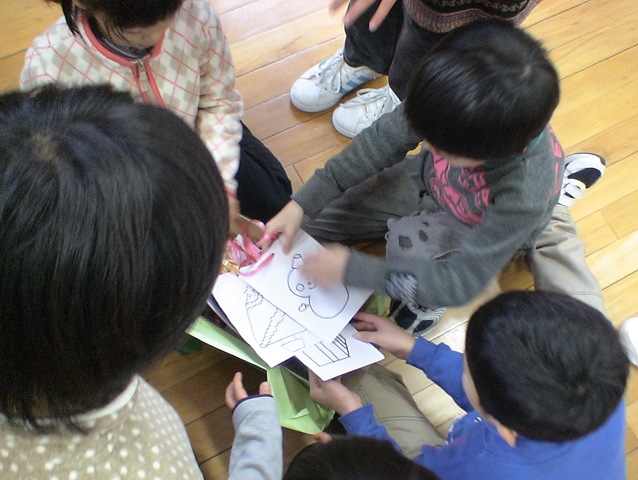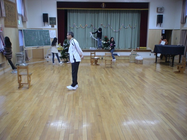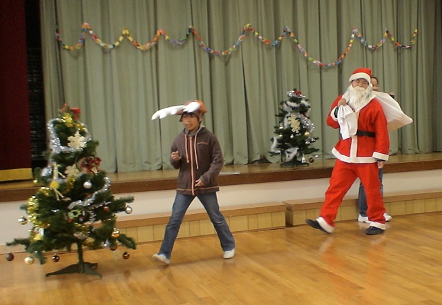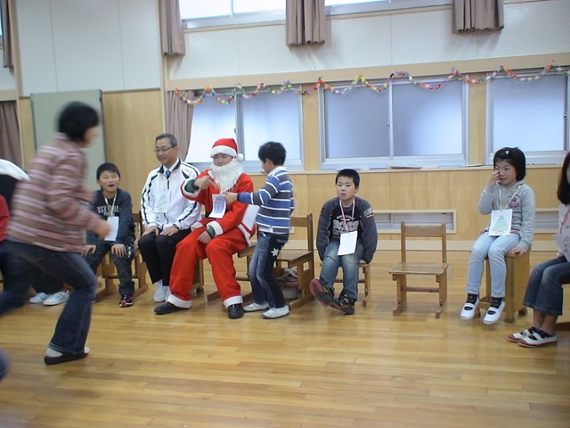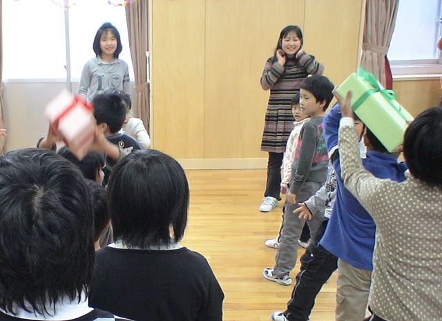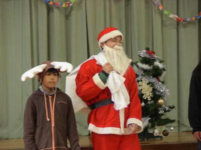 準備が終わって待っていると・・・トナカイとサンタが登場!! 仲良し班にpresentをくれました。リボンをつけたままのpresentの箱を使ってgameを一つ。game後,箱の中身を見てみると・・・
