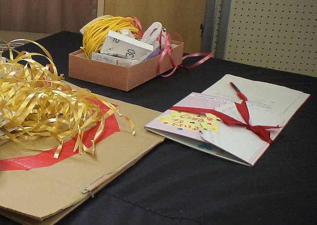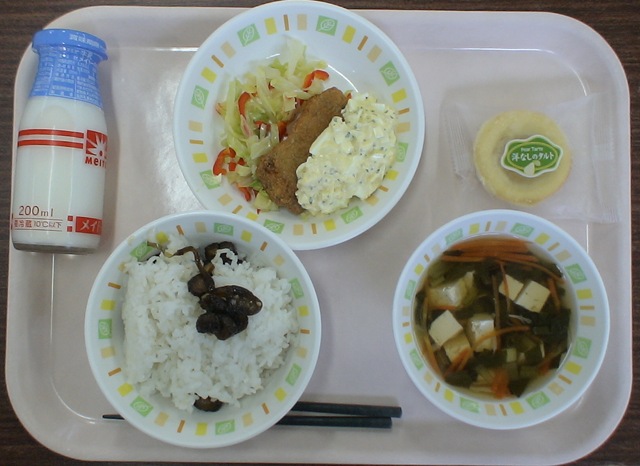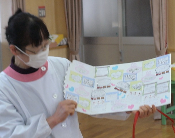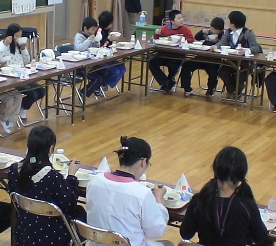 ロの字にテーブルを配置して齋藤さんは正面に位置していただきました。楽しい会話が飛び交う会食になりましたよ。実は今日の給食メニューは齋藤さんの好物ばかりなんだそうです。子どもたち手作りのプレゼントを渡しました。椅子取りゲーム(献立バスケット)を楽しみました。齋藤さんの秘密がわかる○×クイズもありました。