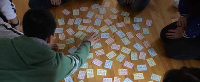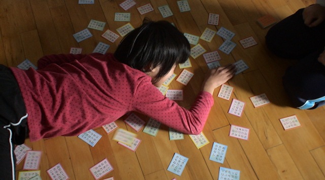 昼からの百人一首大会。毎年行っていますので,高学年ともなると上の句の読み上げで素早く札を拾ってしまう子も出てきます。冬休み中に一生懸命に句を覚えてきた子もいます。熱が入りすぎて,勢いあまって,飛び込むように札を取るシーンもありました。各学年で先生方を加えて札を取り合い,最後は縦割り班の合計獲得札数で競いました。今年は秀吉チームが