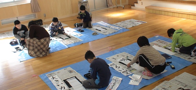講堂で書き初めに取り組んでいます。「3・4年生と5・6年生は広い場所で伸び伸びと字を書いてみよう」としてみました。学習机に向って書いているよりは書き初めらしいと思えますが,いかがでしょうか。太筆を大胆に使って,太く力強い字を書くことができたようです。