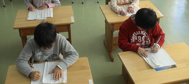 1・2年生は硬筆ですので,それぞれの教室で取り組みました。どの学年も真剣に取り組むことができていまし た。休憩をはさんで2時間近く,静かで程良い緊張感に包まれた時間を,学校全体で共有しました。