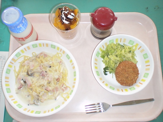 パスタはスパゲティーと解釈してよいものでした。なかなかのボリュームがあって,お腹大満足のメニューです。”わくわくこんだて”の名称がついていました。食してみると,味もしっかりしていて大変おいしい。さすがは齋藤さんの調理は素晴らしい。「確かにこれはいろいろな意味でワクワクするメニューだわい」と実感しました。