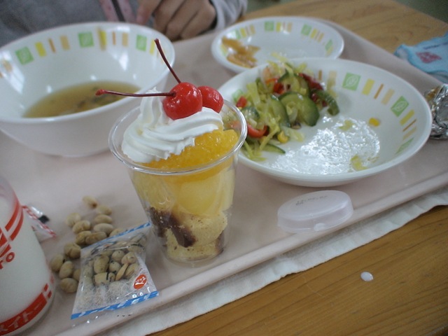 これが本日のメニュー。子どもたちのお目当てはなんといっても盛りもりパフェだったと思います。これは給食をつくってくださる齋藤さんのオリジナルパフェ! 味もボリュームも大満足の逸品でした。