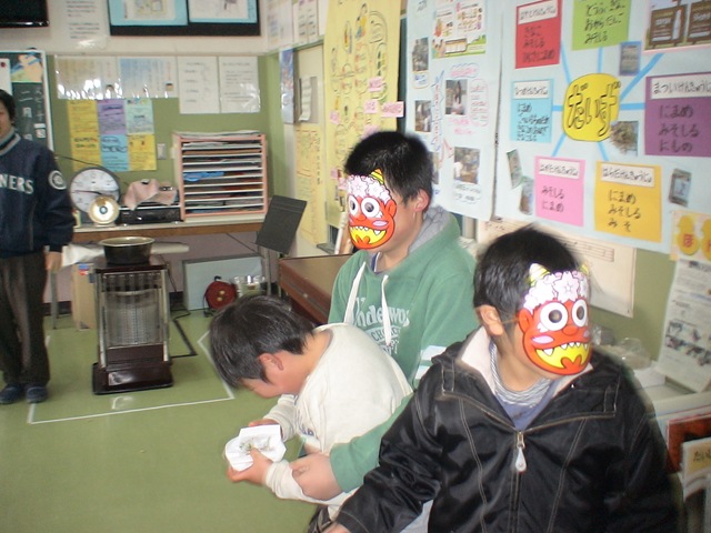この写真にはメニューにないものが写っています。牛乳の横の袋に入ったものなのですが,おわかりでしょうか。2月3日は節分の日,豆まき用の豆なのです。本校では2月3日に児童会の子たちが豆まきを行うことが恒例になっています。今年は3日が日曜日です。そのため前倒しをして今日実行されました。給食を食べ終わる頃を見計らって鬼が乱入,待ってましたと豆で追い払う子どもたち。鬼(邪悪? 悪運? インフルエンザ?)を追い出して気分爽快。そして,いよいよ4日月曜日に「ありがとうの会」を迎えます。