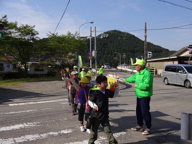 学校横の清崎信号交差点は,朝夕の登下校の時間帯には,交通量がかなり多く,自動車がスピードを出して通ります。カーブで坂にもなっていて,危険度の高い交差点です。子ども自身も交通安全に気をつけていますが,いつもスクールガードの皆さんが交差点に立って横断時の安全を見守ってくださっています。