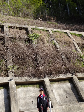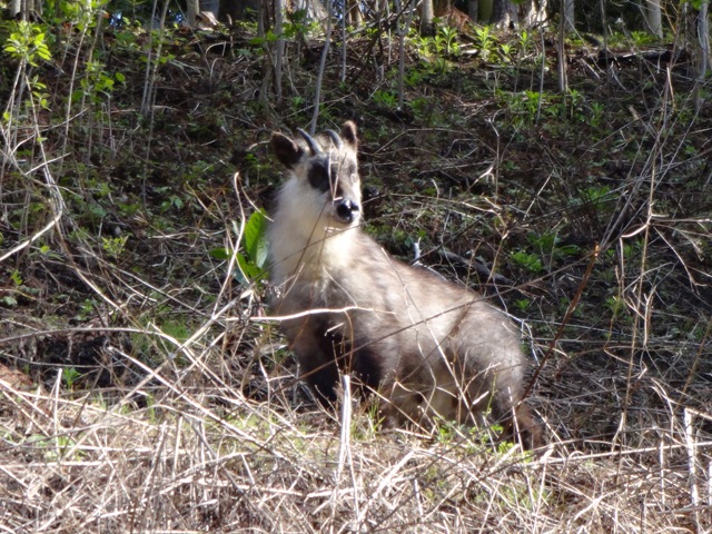 5月1日(水)朝,通学路脇の土手(山の急斜面)の高い所にカモシカが現れました。登校中の子どもたちをじっと見つめていました。