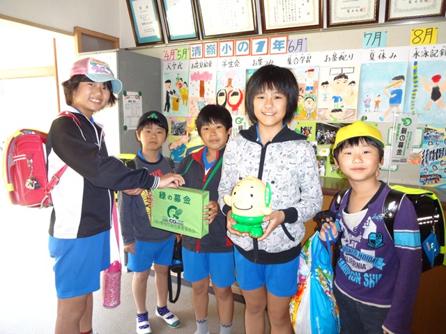 「緑の募金は,地球に森林を増やすために木を植えたりすることに使われます。みんなで積極的に緑の募金に取り組んで,緑の地球を守っていきましょう。家の人にも協力してもらうようにたのんでください。ご協力をよろしくお願いします。」