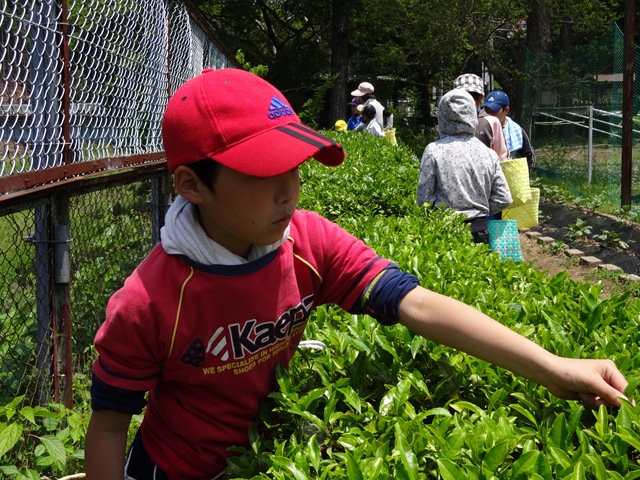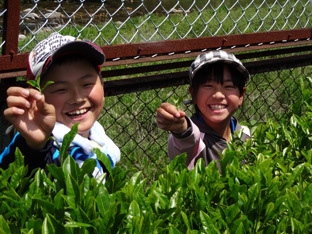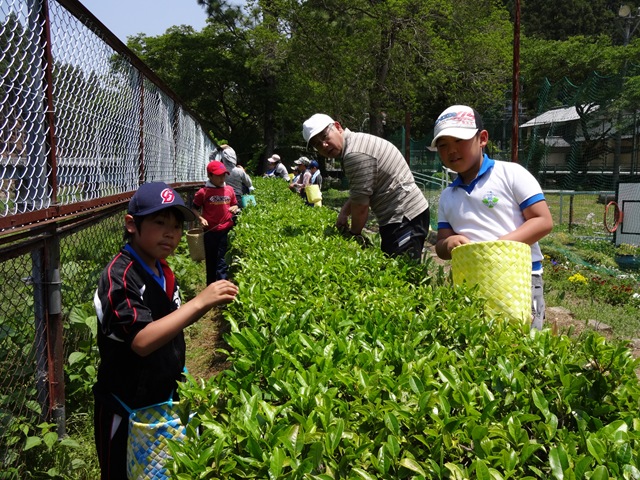 さて,収量ですが,今年の校内お茶摘みでは,生葉8.5kgを摘むことができました。昨年度よりも,2.5kgの増です。今年は,お茶の新芽が出たころに霜が降り,「お茶の葉の育ちがあまり良くない」と言われていたので,予想よりも多く摘めて,特にがんばった高学年の子たちは,ガッツポーズをして喜んでいました。