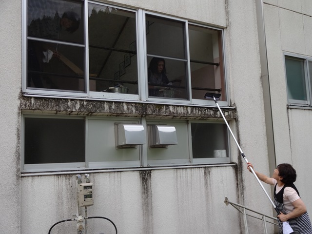 外からもしっかりふきました 高学年女子は親子で窓ガラスをきれいに
