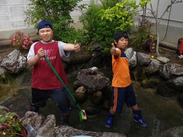 池をばっちりきれいにした高学年男子 みんな真剣に草取り 大勢の力はすごい!