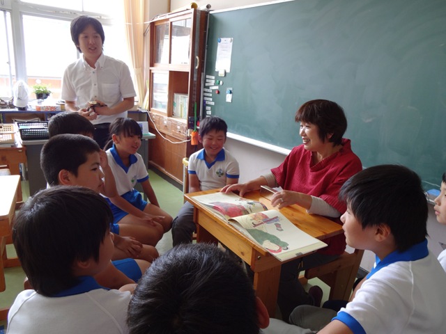 1・2年生には,後藤香奈子さんが,『つながってる!』という,へそのおの話からいのちのつながりのすばらしさを実感することができる絵本を読んでくださいました。「へそのおのこと,知らなかった。」とびっくりした子どもたちは,香奈子さんのお話を聞いて,「自分のへそのおのことや自分が生まれたときのことを家の人に聞いてみる。」と盛り上がりました。