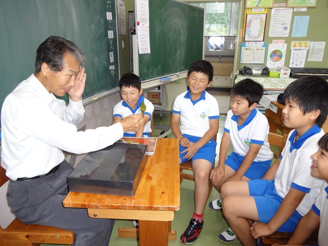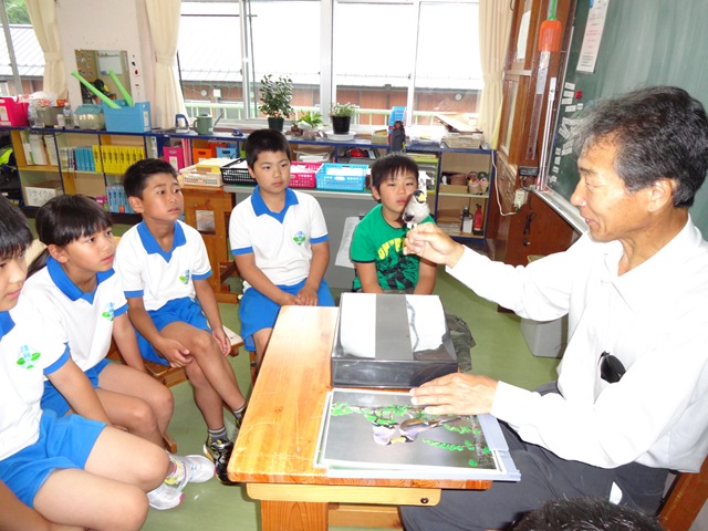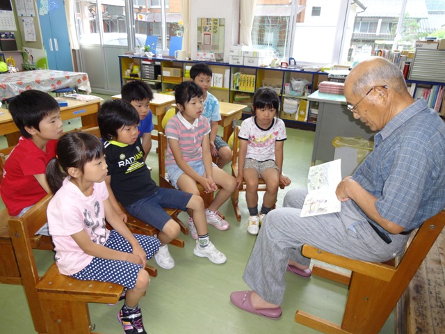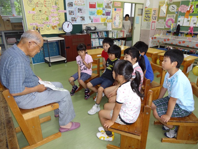 1・2年生には,夏目順啓さんが,「おじいちゃんがこどものころ」という本を読んでくださいました。夏目さんは,読み聞かせをしながら,ご自身の子どものころのお話もしてくださいました。子どもたちは,「五右衛門風呂(ごえもんぶろ)の底が抜けた話」や「風呂敷包みで学校へ通った話」などに,大笑いしたり,感心したりしながら,熱心に聞き入っていました。夏目さんのおかげで,子どもたちは,昔のことを知ることができました。