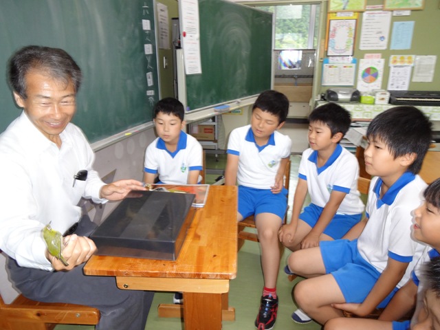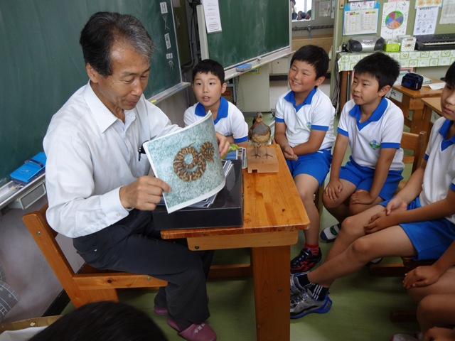 3・4年生には,加藤博俊さんが,「鳥の聞き做し」についてお話をしてくださいました。「聞き做し」(ききなし)とは,鳥のさえずりを人間の言葉にしたもの,時には,意味のある言葉やフレーズに当てはめて覚えやすくしたものです。野鳥の声を語呂合わせして覚えて,楽しむことで,昔からよくされていることです。加藤さんは,鳥の剝製(はくせい)や写真も見せてくださって,ウグイス,ツバメ,コマドリ,アオバト,シジュウカラ,ホトトギス,コジュケイなど,いろいろな鳥の聞きなしを紹介してくださいました。子どもたちも,声に出して,聞きなしを楽しみました。教室に笑顔が広がり,明るい聞きなしの声が響きました。子どもたちの覚えが早いのにも感心しました。