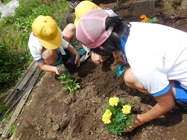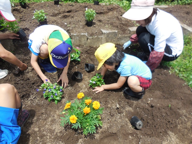 みんなで協力して,サルビアとマリーゴールド,日々草の苗を植えました。