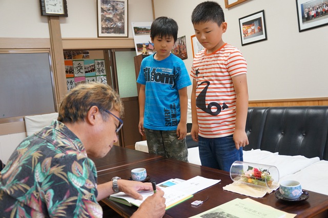 夏丸さんの書かれた図書館の本『ライギョのきゅうしょく』にサインをしていただきました。代表は,