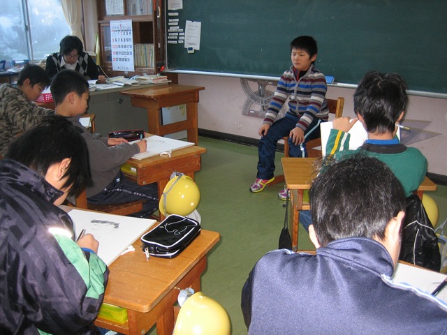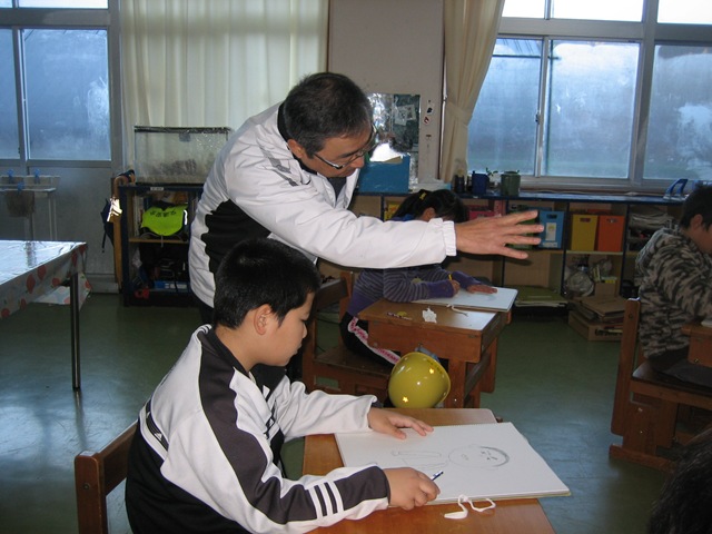 3・4年 校長先生からアドバイスをいただきながら,モデルの友達をよく見て描きました。