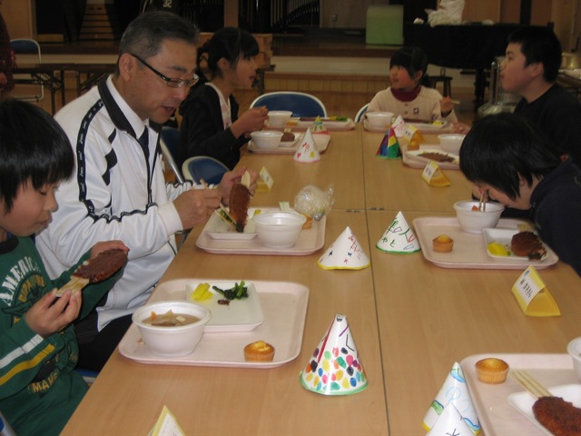 講堂で全校会食の形をとって実施しました。