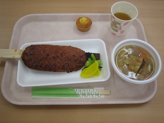 献立・・・五平餅,けんちん汁,漬物,カステラミニカップケーキ,お茶