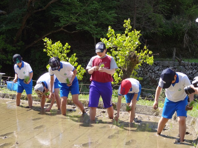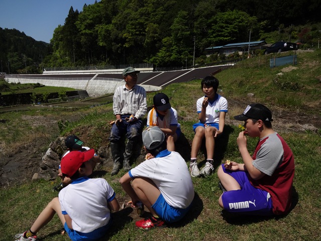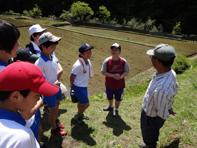 今日,5・6年生は,清崎の夏目康弘さんの田んぼで,田植えをさせていただきました。