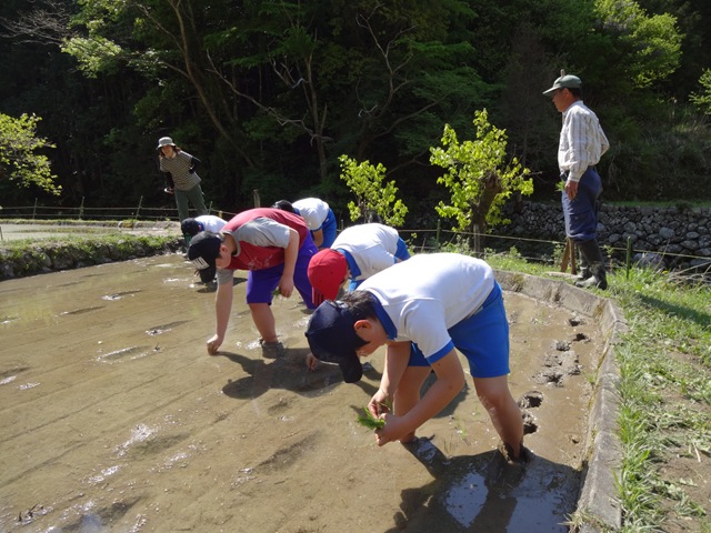 はじめは,足を泥に取られながら,慣れない手つきで,四苦八苦していましたが,次第に上手になり,1時間ほどで1枚の田んぼの田植えを完了しました。