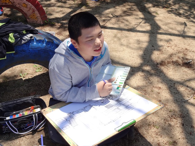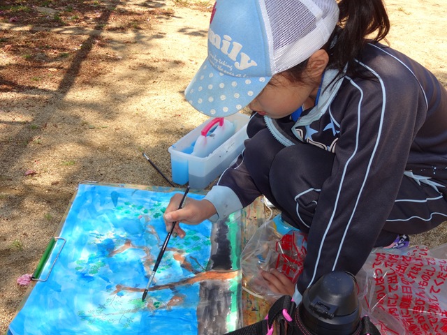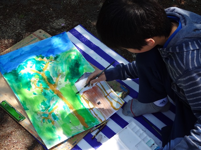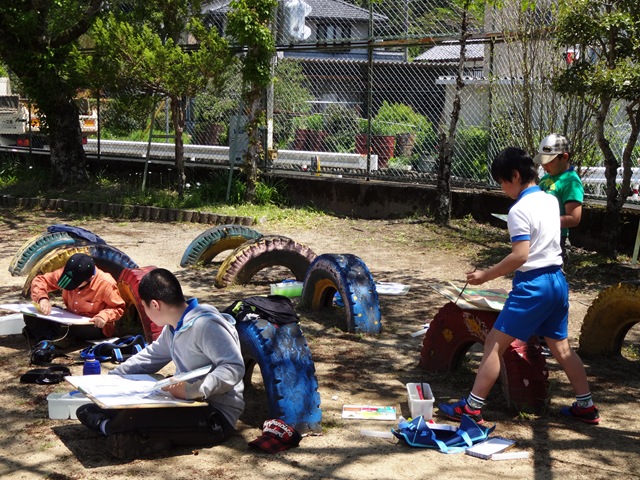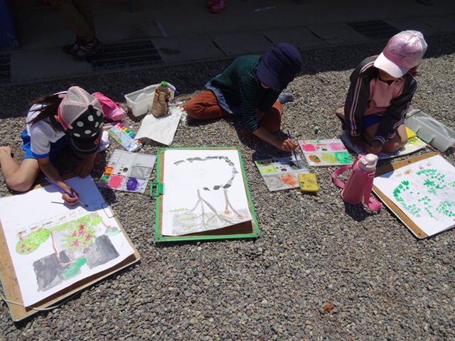 子どもたちは,各学年のテーマを踏まえ,それぞれお気に入りの場所で絵を描きました。