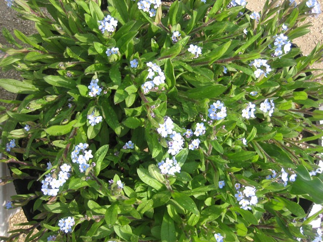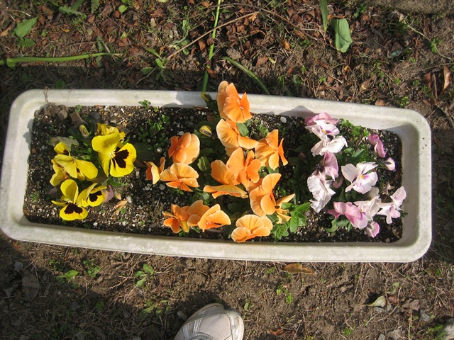 子どもたちがプランターに植えたパンジーや忘れな草も,かわいらしく咲いています。