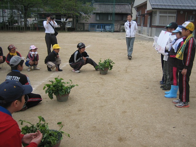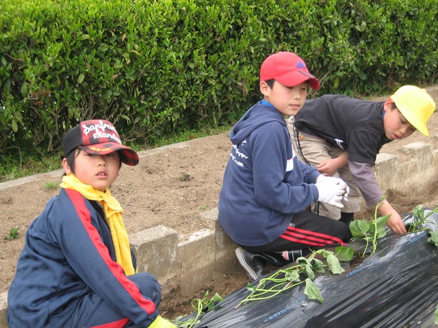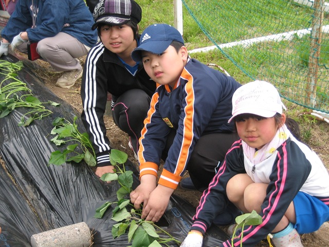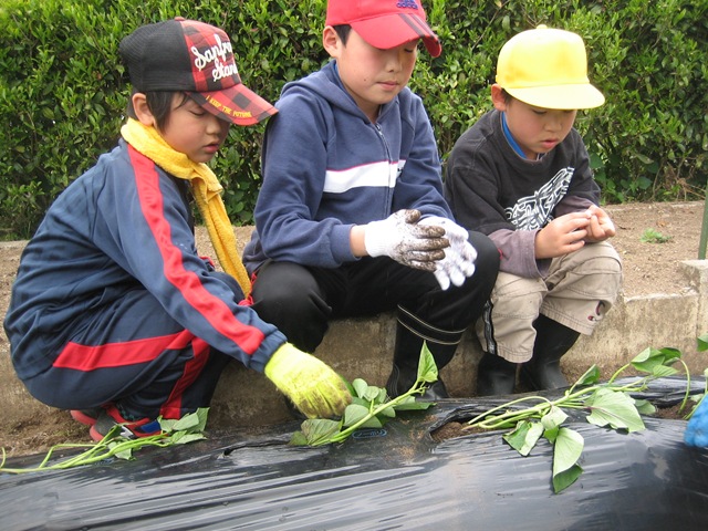 今年もなかよし班ごとに「サツマイモのつるさし」をしました。昨年は,大きな芋がたくさんできました。今年も,どの子も一生懸命植えたので,きっとたくさん実ると思います。
