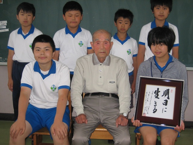 また,七原さんは,「明日に生きる」という言葉を色紙に書いて,子どもたちに贈ってくださいました。