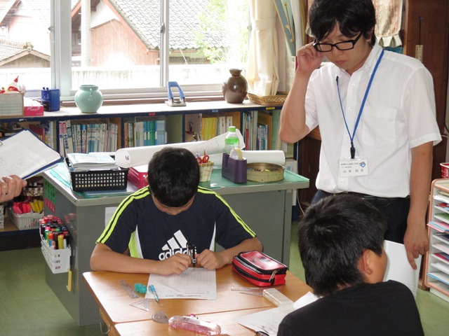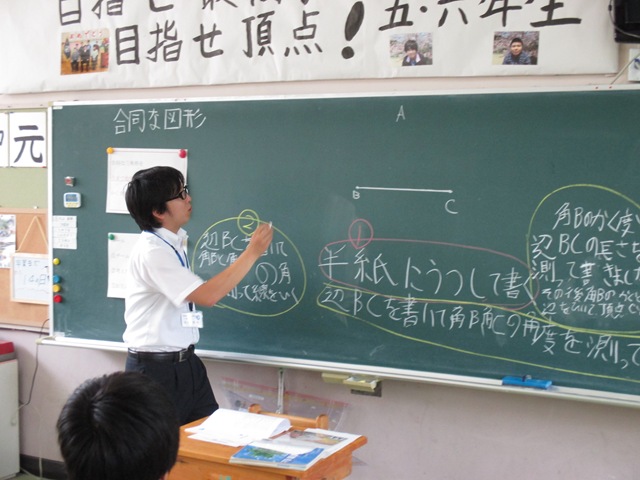 子ども同士が向き合って,教え合う姿がありました。先生が5年生を指導しているとき,間接指導で,黙々と課題に取り組む6年生の真剣さがよかったです。多様な考え方を引き出し,四つの考え方が出ていました。複式学級,少人数のデメリットを,メリットに変えていました。子どもと先生が信頼し合っているということがよく分かりました。