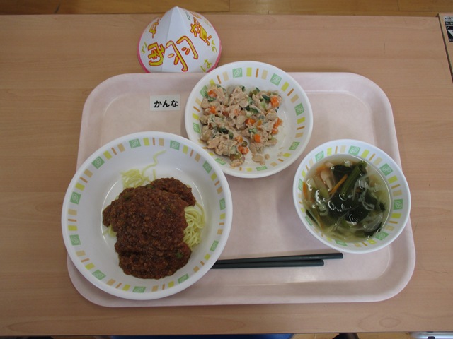 献立:ジャージャー麺,豆と野菜とシーチキンのサラダ,ベーコンと野菜のスープ,牛乳