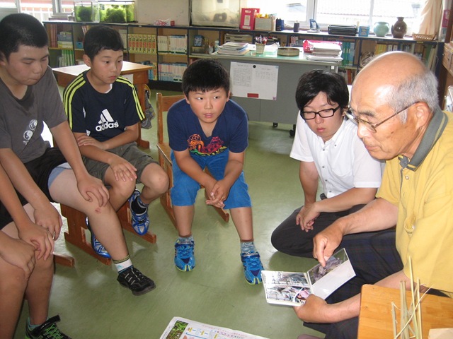 米作りに関する写真も持ってきてくださり,籾蒔きの様子やお孫さんが田植えをしている様子も紹介してくださいました。実際に,稲穂のついた藁も見せてくださいました。