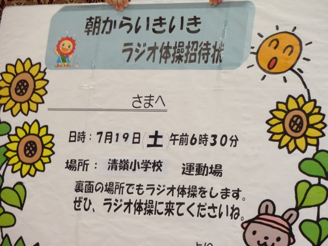 「今年も,7月19日(土)の朝6時30分から,清嶺小学校の運動場で,『朝からいきいきラジオ体操』を行います。みなさん,お家の人と一緒に参加してください。招待状を書いて,ご近所の人も誘ってください。『からすみ作り』や『いきいきちゃん一品料理コンテスト』などもありますので,ぜひ参加や応募をしてくださいね。」