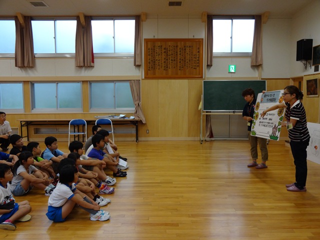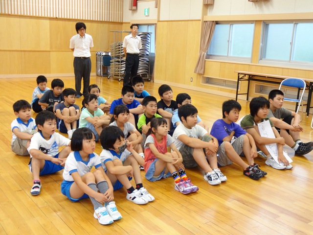 7月14日(月)の朝礼時に,したら保健福祉センターの方から,『朝からいきいきラジオ体操』などについて,説明をしていただきました。子どもたちは,熱心にお話を聞いていました。