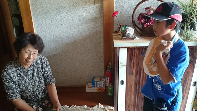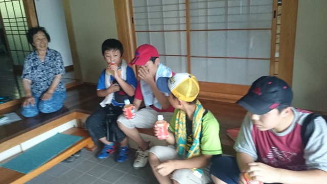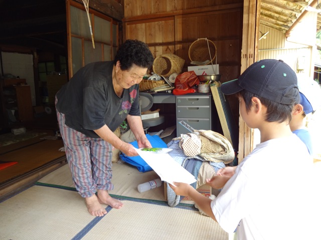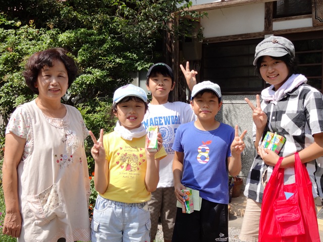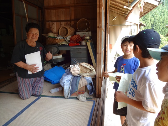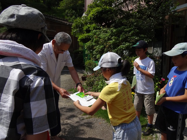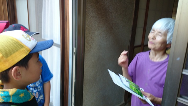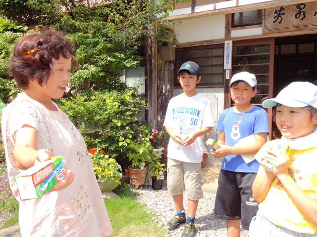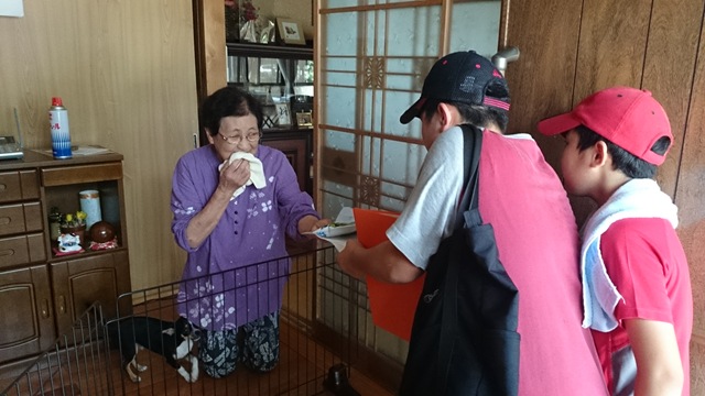 子どもたちは,32℃を越す暑さの中,照り返しの強い舗装道路や,草木の香りがむんむんする山道やあぜ道を,お年寄りのお宅を目指して,がんばって歩きました。