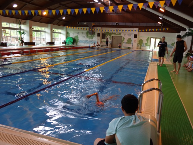 ①1・2年のタイム泳,②3~6年の各学年の自由形タイム泳,③3~6年の各学年の平泳ぎタイム泳,④1・2年の5分間距離泳,⑤3・4年の7分間距離泳,⑥5・6年の10分間距離泳