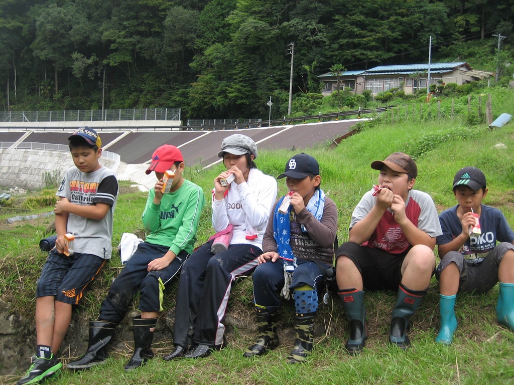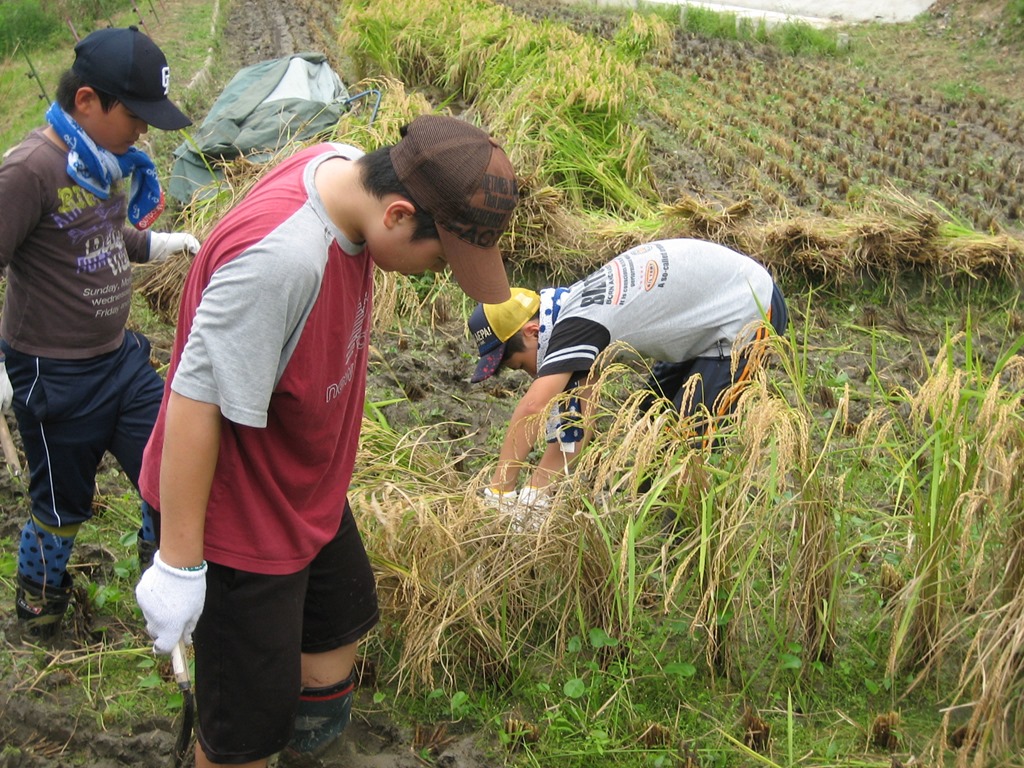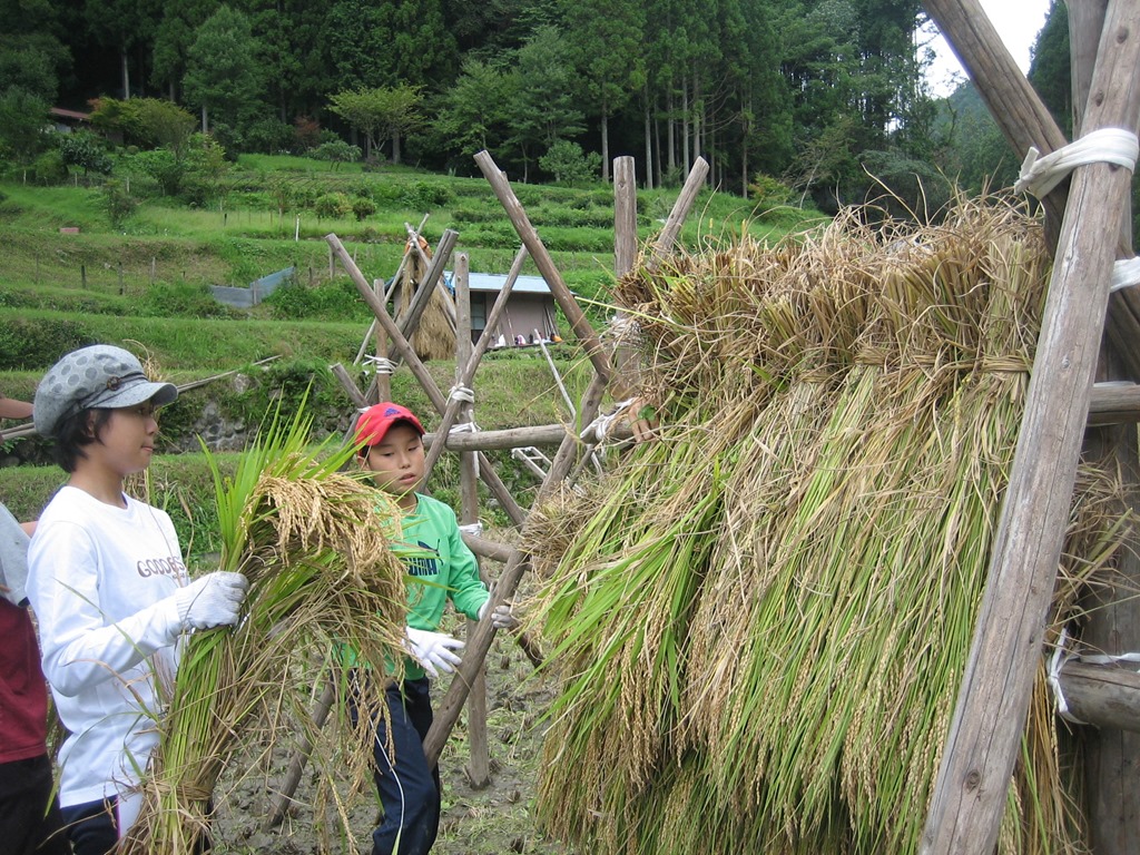 今の米作りは、機械化が進み、多くの場合、コンバインで刈り取ってもみにし、すぐに大型乾燥機で乾燥させ、もみすりまで短期間でして玄米にしますが、子どもたちは、鎌で刈って、稲束をはざに掛けることをしました。
