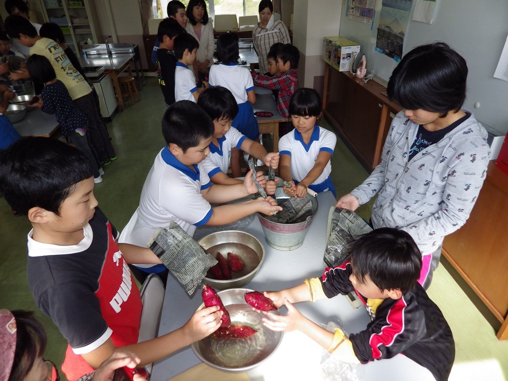 3・4年生は、担任の先生と一緒に、おいしい焼き芋の作り方を調べ、それを全校に紹介しました。作り方の説明を聞いた後、なかよし班ごとに協力し合って、焼き芋つくりをしました。