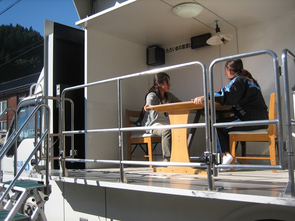 今回、役場の防災担当の方のご配慮で、地震体験車「なまず号」に実際に乗車して、地震について学習する機会を設けていただけました。