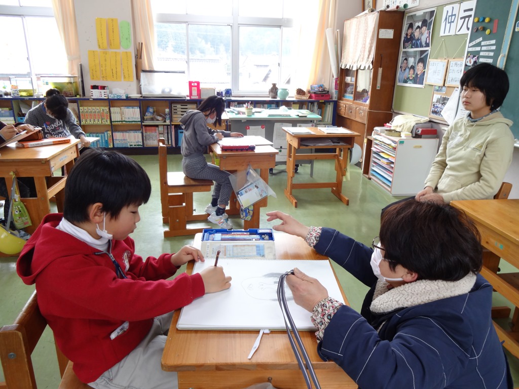1年生から5年生の18人が、卒業をする6年生二人をモデルに、心を込めて描きました。