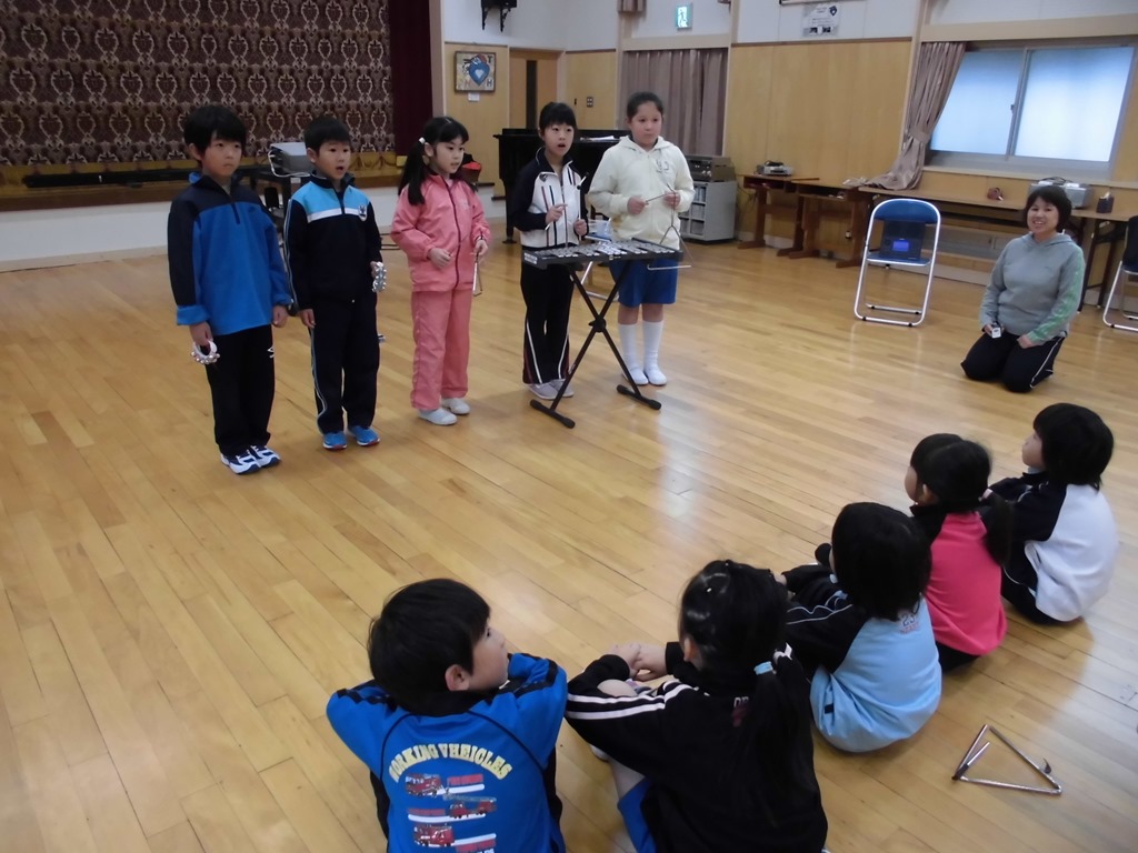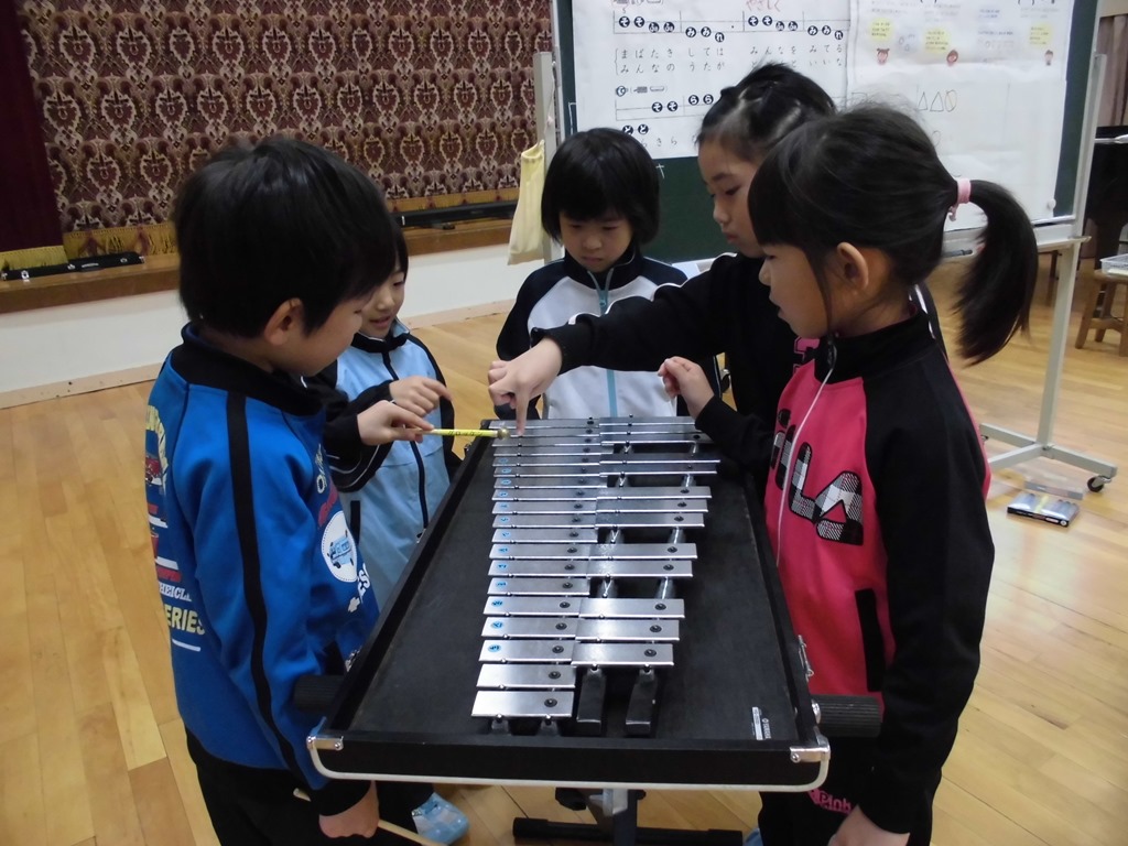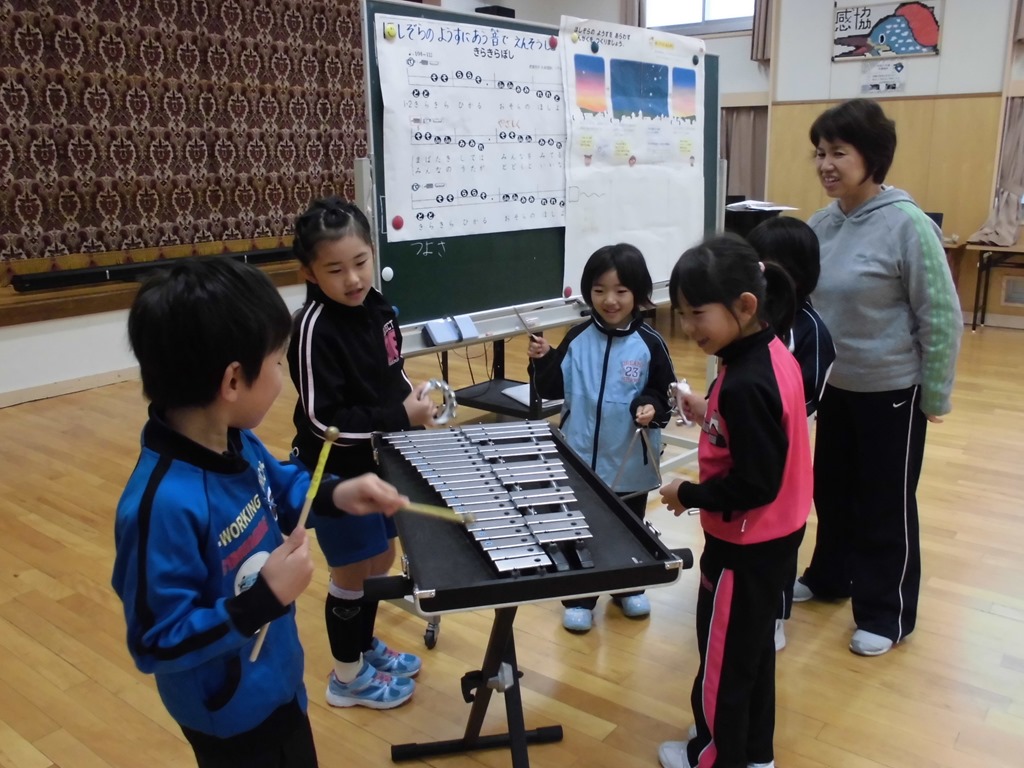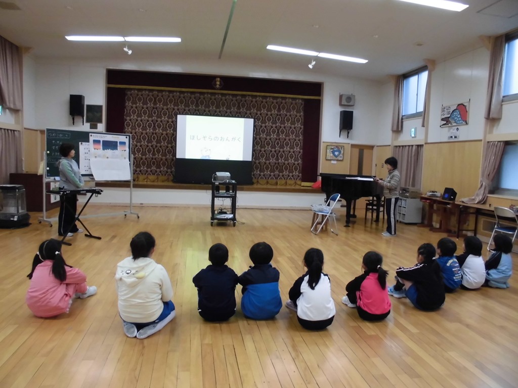 音楽では、♪きらきらぼしを学習しました。鉄琴やトライアングル、鈴などの星をイメージしやすい音色の美しい楽器も取り入れ、かわいらしい歌声を響かせました。