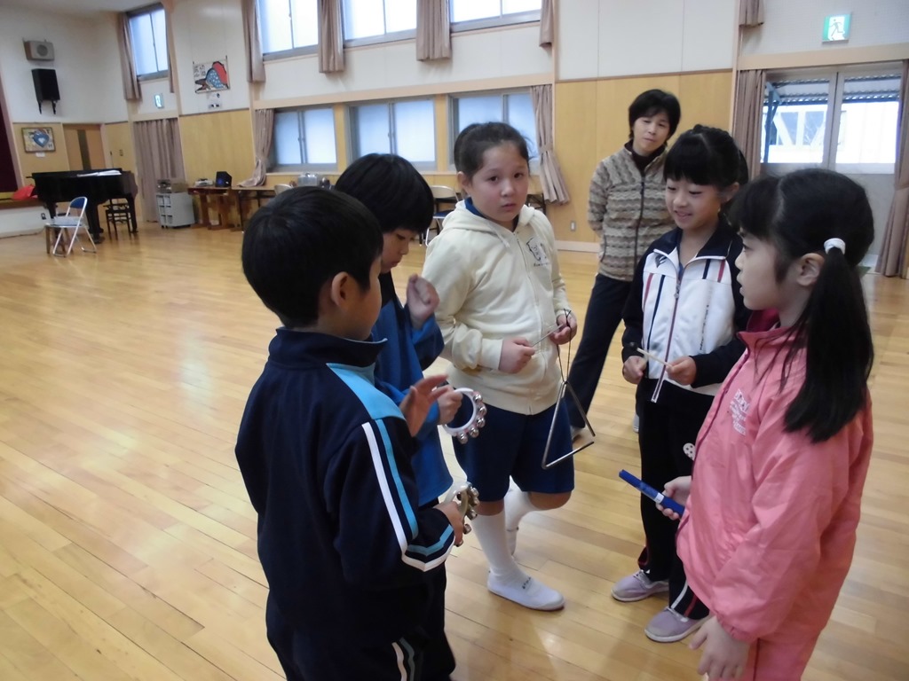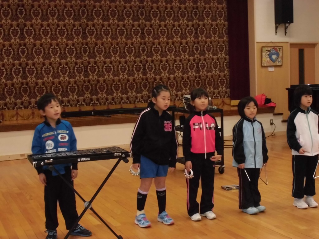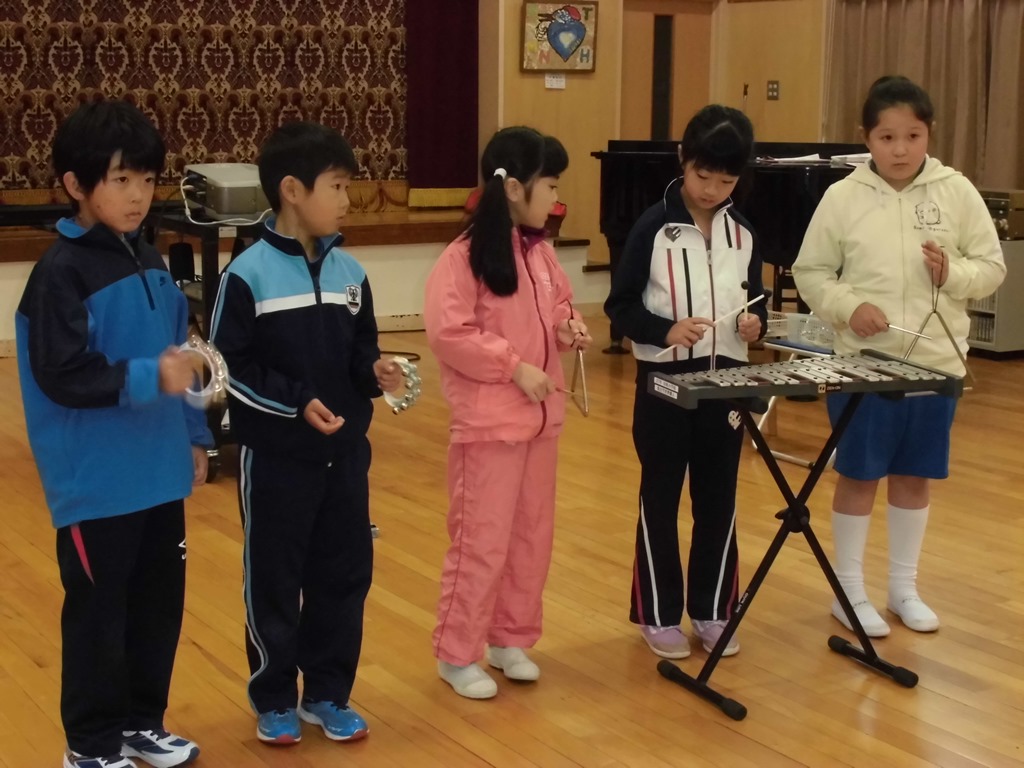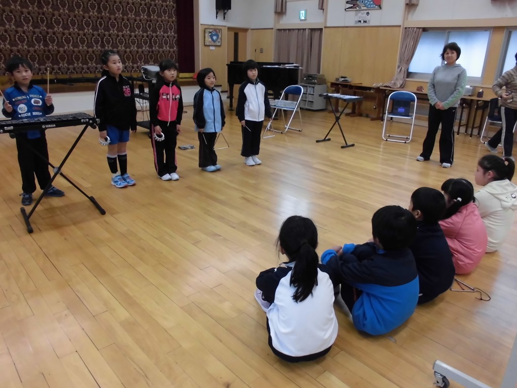 音楽では、♪きらきらぼしを学習しました。鉄琴やトライアングル、鈴などの星をイメージしやすい音色の美しい楽器も取り入れ、かわいらしい歌声を響かせました。