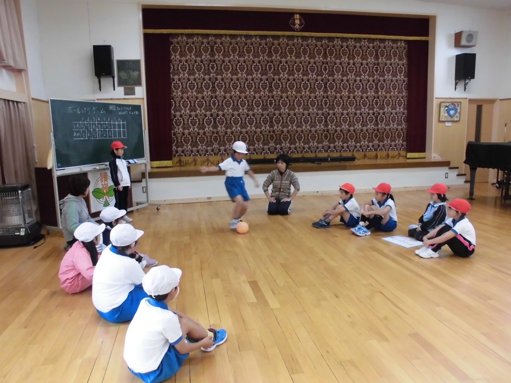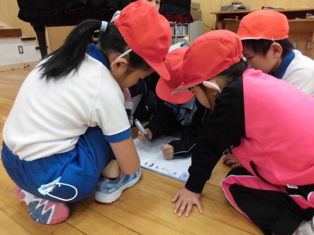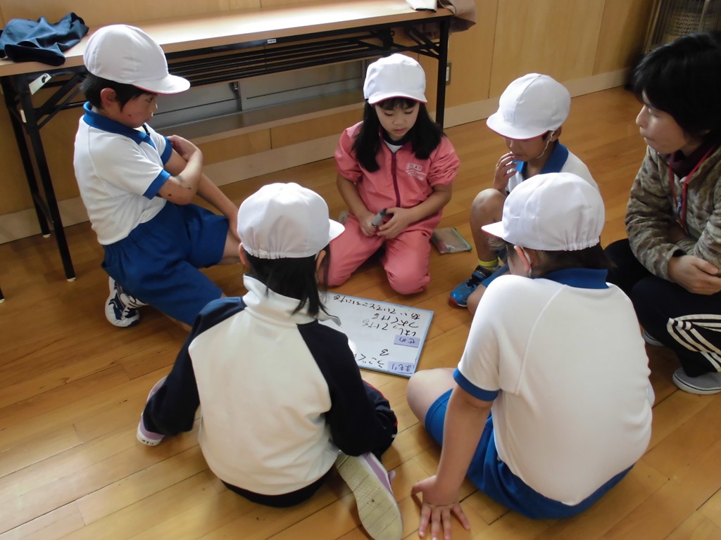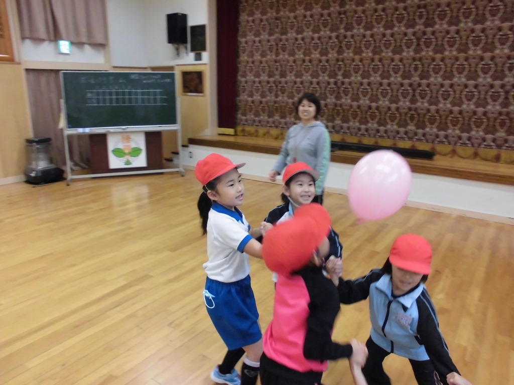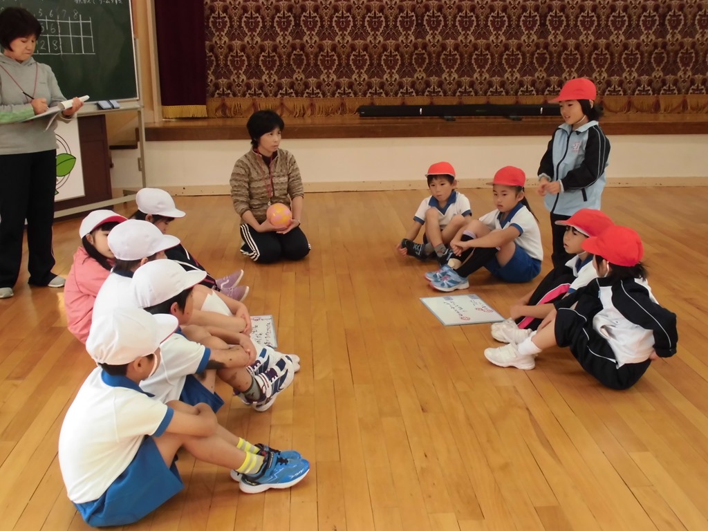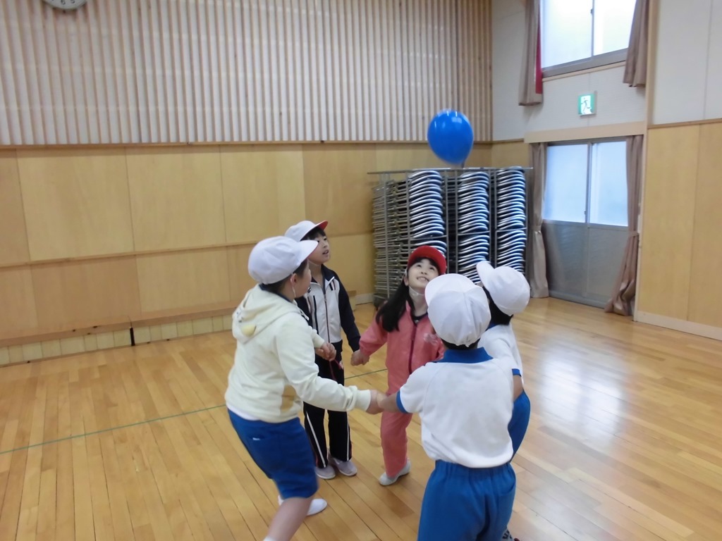 低学年の体育では、ふうせんリレーやならびっこキックベースをしました。作戦を考えたり、友達のよさを発言したりして、頭も働かせ、体も元気いっぱい動かしました。