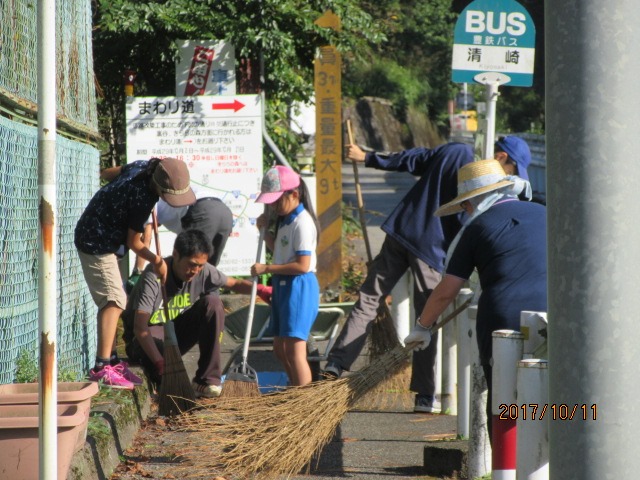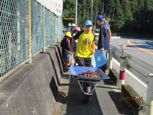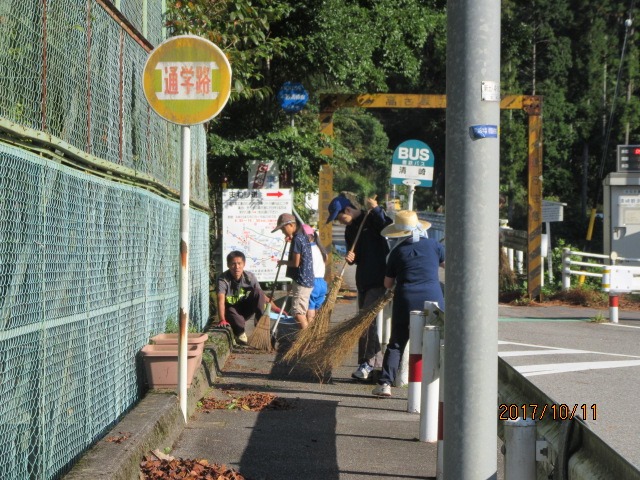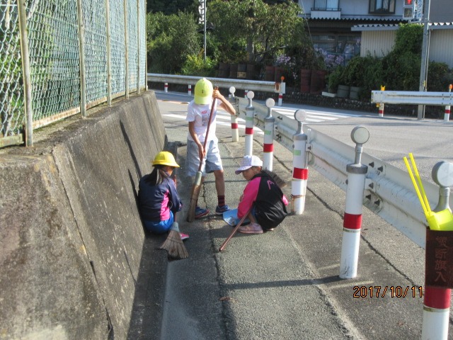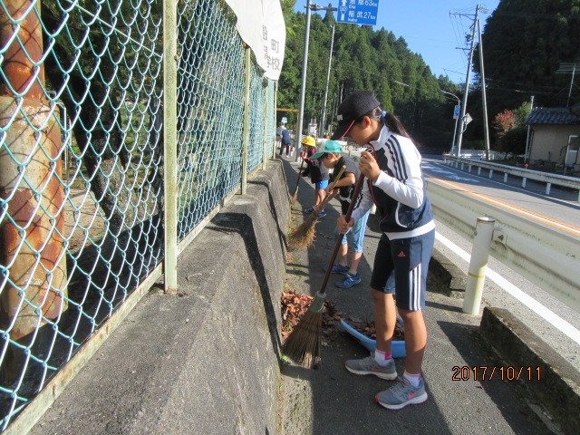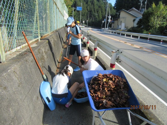 全校みんなで、国道横の歩道の落ち葉はきをしました。