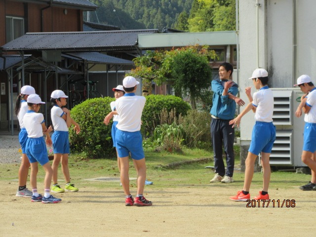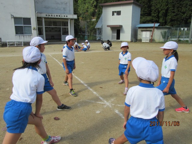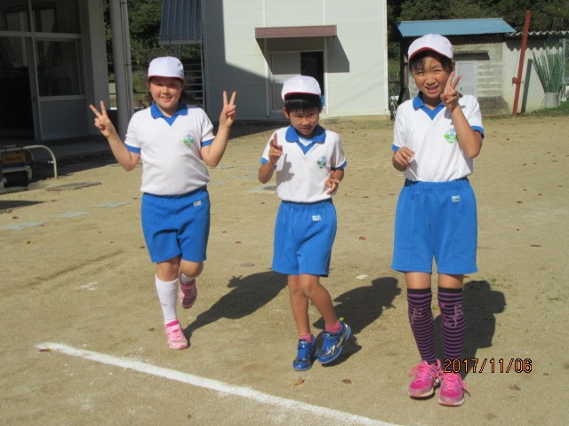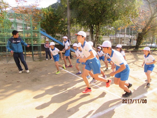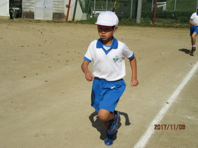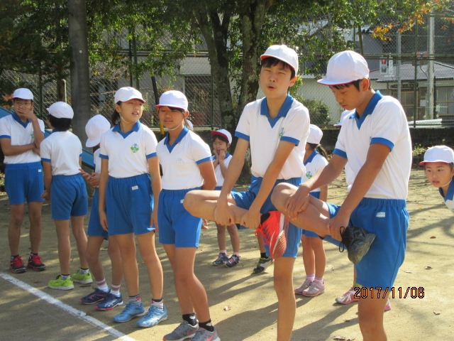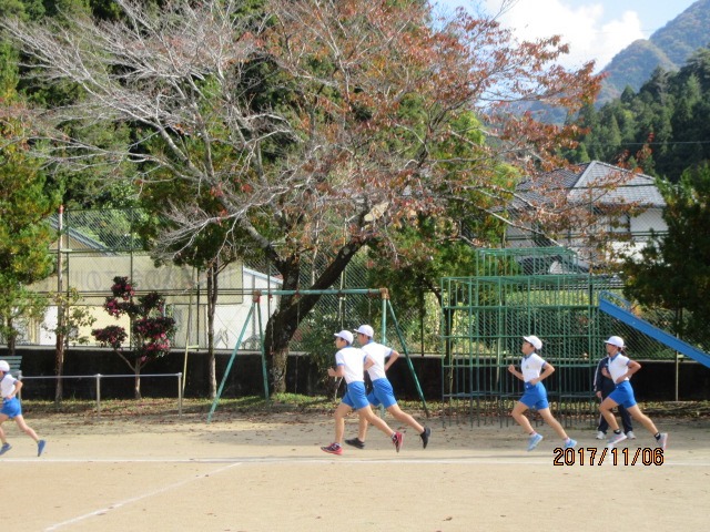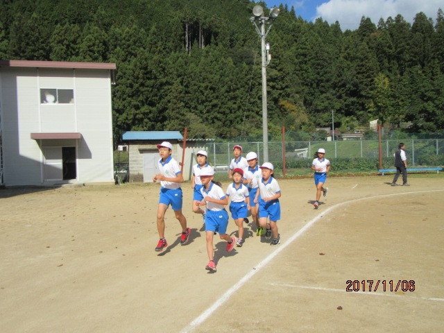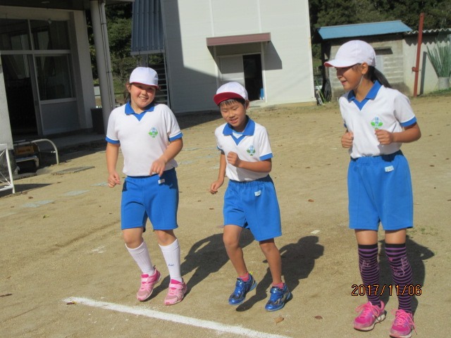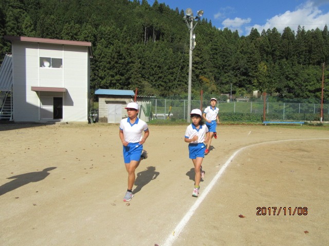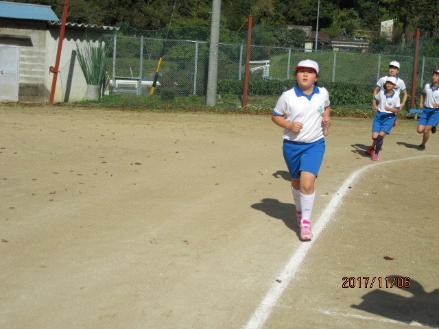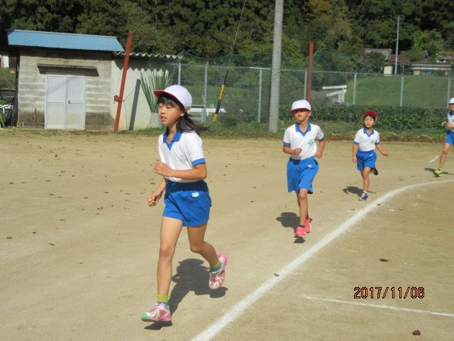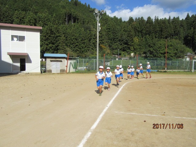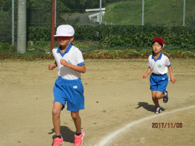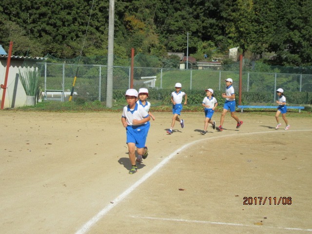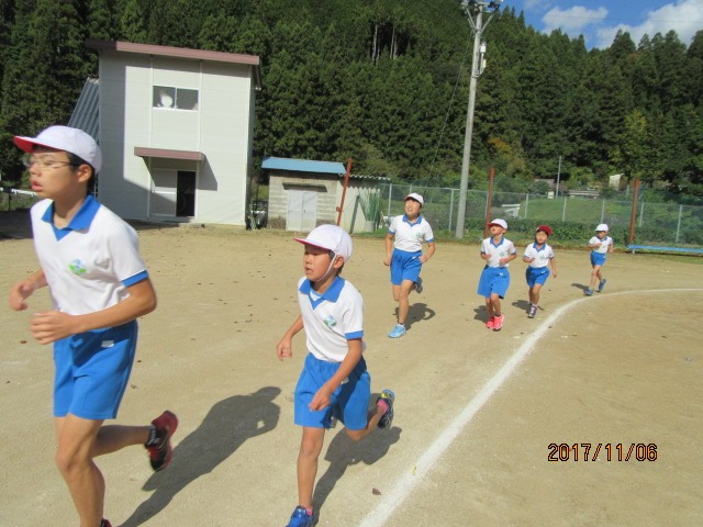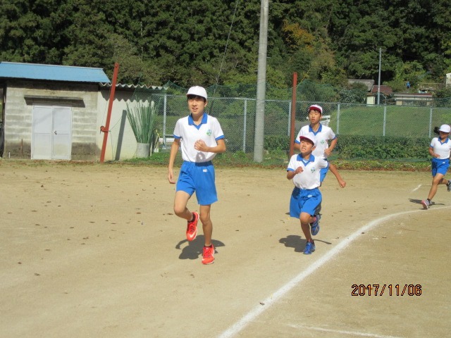 子どもたちは、今は校外のコースには出ず、運動場を7分間走っています。