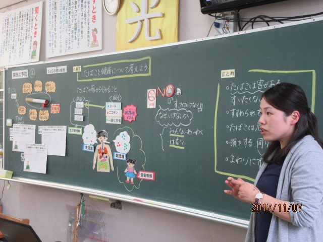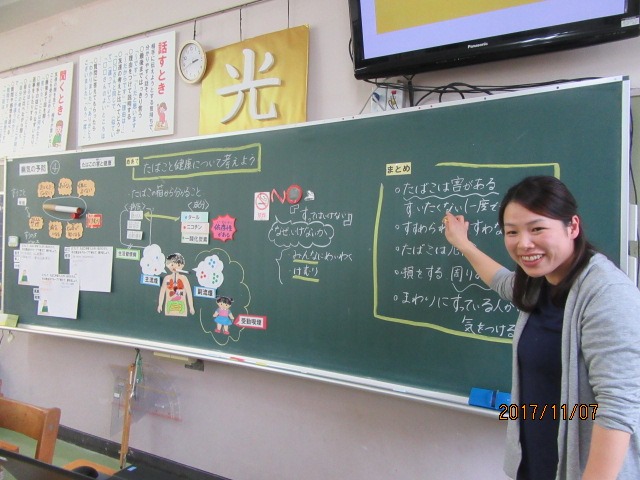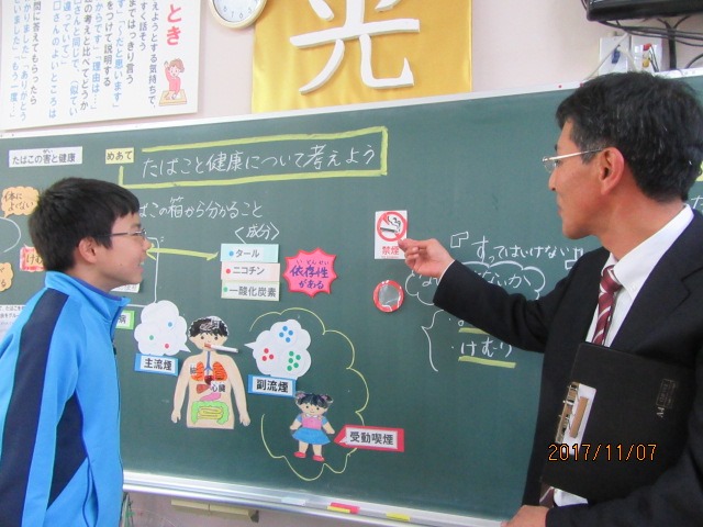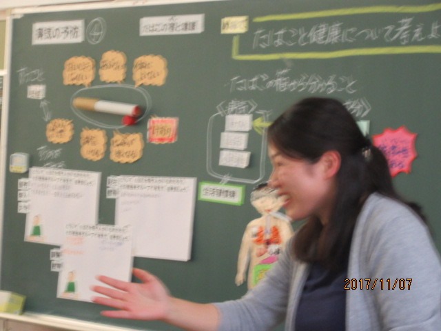 また、養護教諭が周到に教材研究をし、ニコチン依存の仕組みをまとめた絵や、主流煙と副流煙のことや受動喫煙の危険性を知らせる絵、禁煙マークと貼られている場所の写真、「たばこを吸い始めた年齢と肺がんの割合」のグラフ、喫煙者へのインタビューなど、多様な視聴覚教材を適切に用意したことにより、子どもたちの関心は高まり、理解も深まりました。