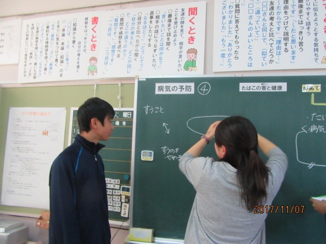 5・6年生7人と養護教諭が、体育科(保健)の授業をしました。単元は、「病気の予防」で、本時は、「たばこの害と健康について考えよう」という授業でした。