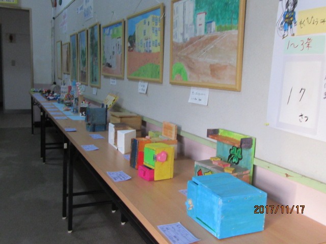 設楽町児童生徒造形展に出品した作品を校内に展示しています。