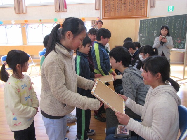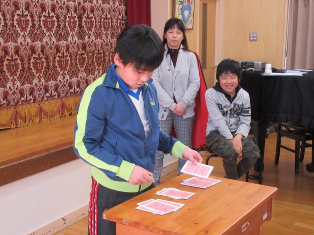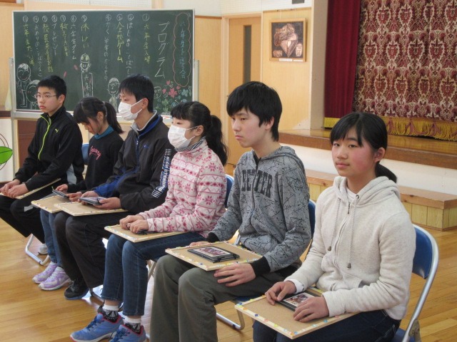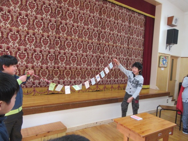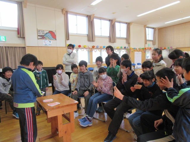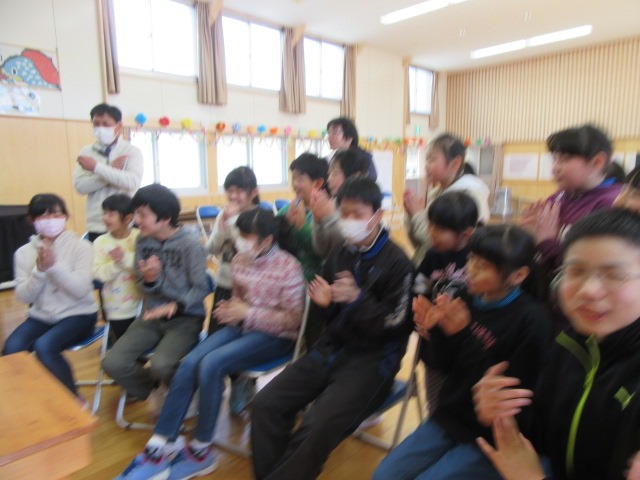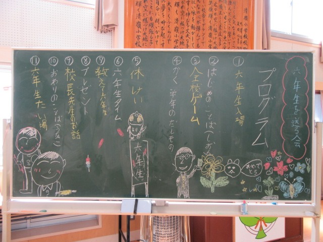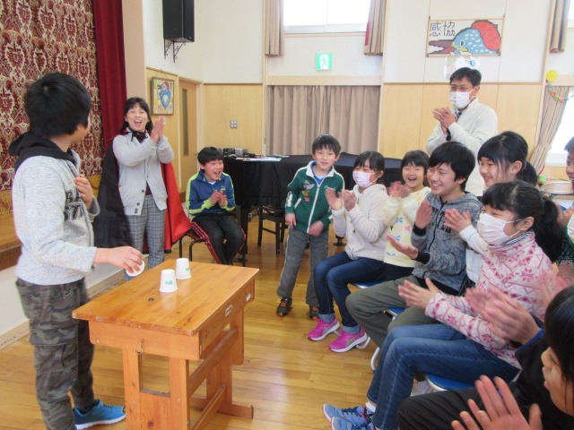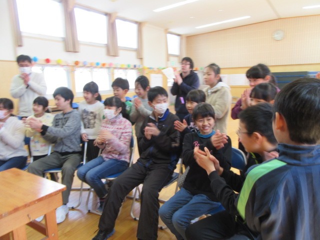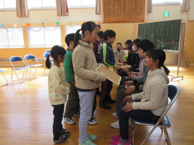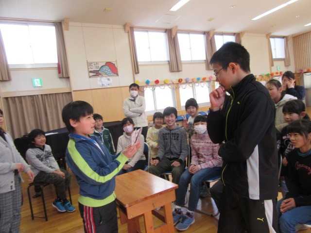 オリンピック種目も入った楽しいジェスチャーゲームや感謝の言葉を完成させるジグソーパズルの組み立て、見事なトランプの手品、6年生による6年間の思い出クイズ、6年生への思い出インタビュー、「いのちの歌」のきれいな合唱、手作りのアルバムとコルクボードのプレゼントなど、どれもすばらしかったです。